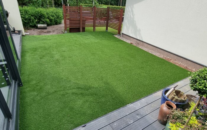 Toteutimme takapihan maisemoinnin tekonurmella avaimet käteen periaatteella. Pihan varjoisuus esti nurmikkoa kasvamasta. Pihasta poistettiin