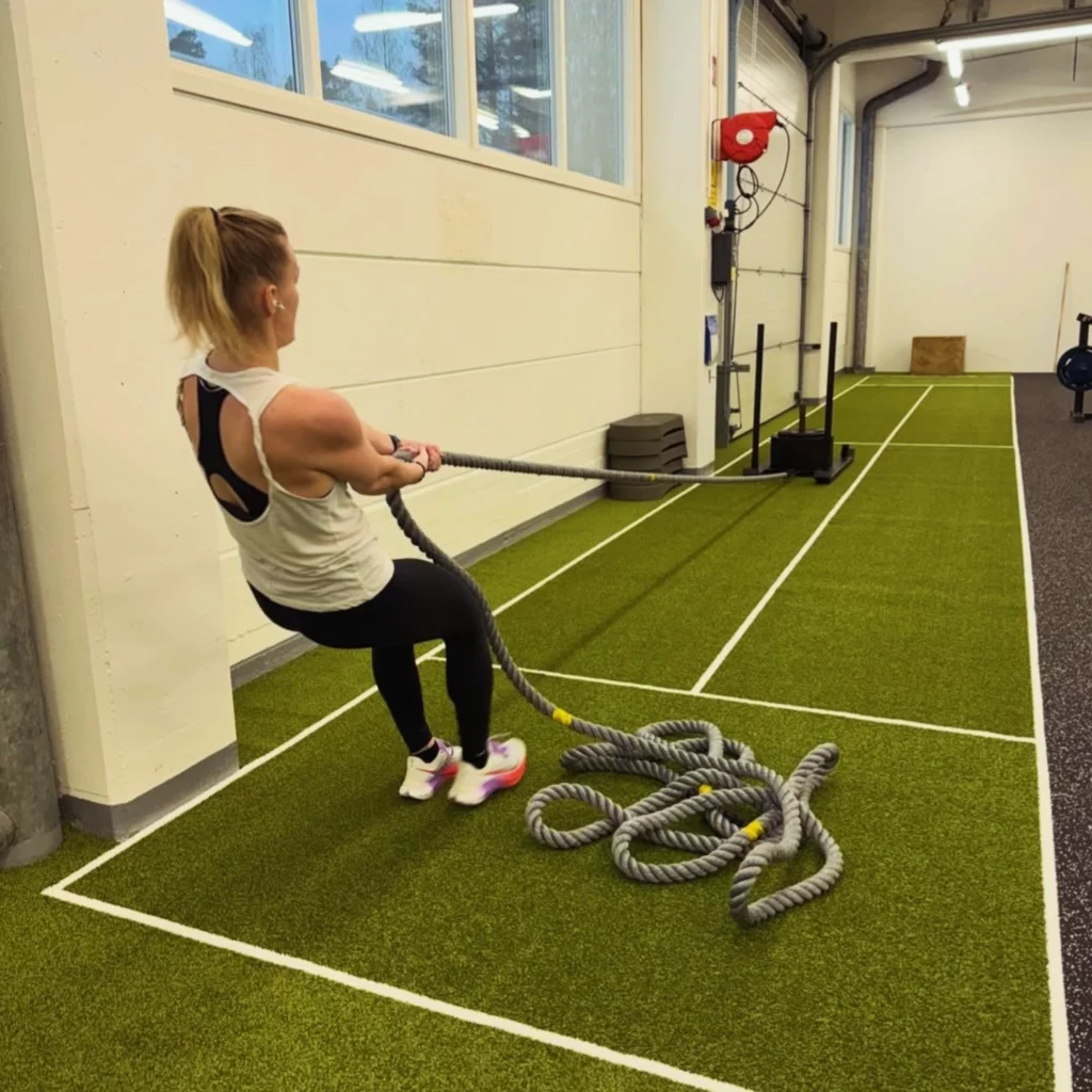 Kyseiselle hyrox radalle jätettiin asiakkaan toiveesta isompi alue tekonurmea toiseen päähän jotta siinä voi lämmitellä sekä säilyttää treenitarvikkeita
